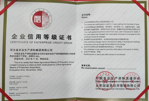 本網訊    近日,中國農資流通協會發布2022年度中國農資流通行業企業信用等級評價結果,河北省農資集團公司再度獲評企業信用等級AAA級,屬于行業信用評價最高等級。