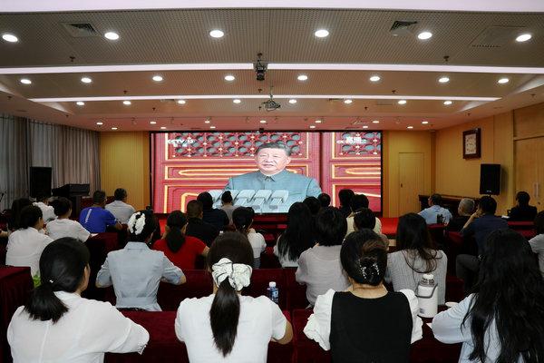 觀看現(xiàn)場氣氛莊重熱烈,全體人員全神貫注、心潮澎湃。屏幕上,受閱部隊官兵軍容嚴整、意氣風發(fā),新型武器裝備悉數(shù)亮相、威武雄壯,充分展示了新時代國防和軍隊建設的輝煌成就,展現(xiàn)了人民軍隊的強軍風采和中華民族走向偉大復興的鏗鏘步伐。英姿颯爽的隊伍、整齊劃一的步伐、鏗鏘有力的口號,無一不令人熱血澎湃,引發(fā)了現(xiàn)場強烈共鳴和陣陣掌聲。