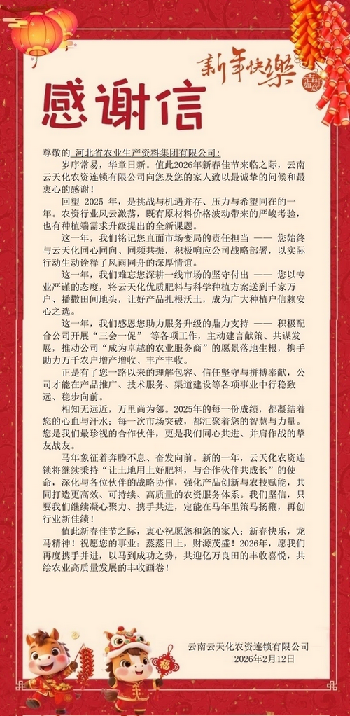 本網訊   近日,云南云天化農資連鎖有限公司、四川發展龍蟒有限責任公司等全國重點化肥企業先后向集團公司發來感謝信,對集團公司過去一年來取得的發展成果表示熱烈祝賀,對雙方良好的合作表示高度肯定,并就集團公司長期以來對企業的大力支持表示衷心地感謝。
